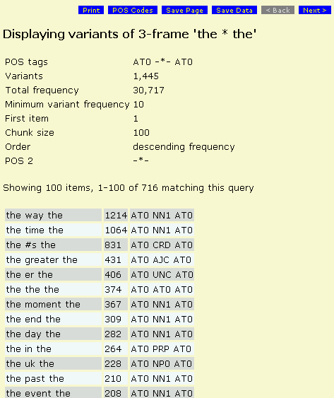 Please take a moment to read the FAQ to understand what this site means by n-grams and phrase-frames, and how the BNC defines words and tags them grammatically with POS codes. Then familiarize yourself with the normalization conventions which are specific to this database. Finally, please remember that this site contains only a subset of the words and phrases in the BNC, those occurring three times or more.
