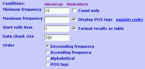 Order specifies (you guessed it) the order in which items are displayed: from most to least frequent or vice-versa, in alphabetical order of the items, or in alphabetical order of the POS tags. If you choose an order other than alphabetical, items with identical values for the primary sort key appear in alphabetical order of the word or phrase. Alphabetical sorts are the most efficient option.
